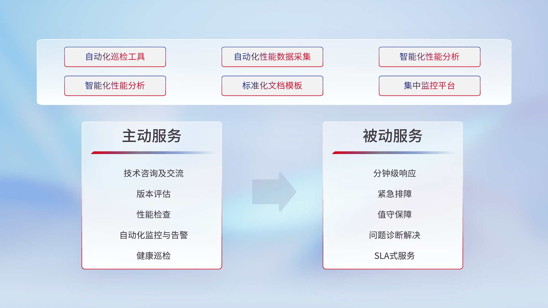 智能化工具和标准化文档,,,保障服务质量,,,提供主动服务(包含技术咨询、、、版本评估、、、性能检查、、、自动化监控与告警、、、、健康巡检)和被动服务包含(分钟级响应、、、紧急排障、、、值守保障、、、问题诊断解决、、、、SLA服务)。。。